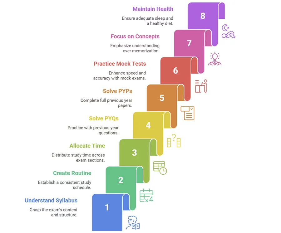 ✔️ Make a weekly learning routine and adhere to it. ✔️ Divide your time equally or accordingly to each section of the exam. ✔️ Be consistent with your schedules. ✔️ Include solving previous year questions (PYQs) in your weekly plan. ✔️ Solve previous year papers (PYPs) after completing the entire syllabus. ✔️ Practice mock tests to enhance your accuracy and speed. ✔️ Get adequate sleep and a healthy diet to avoid diseases. ✔️ Focus on understanding the concepts rather than memorising them. |